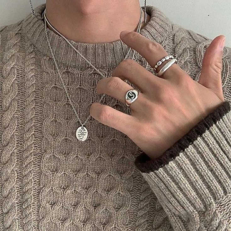 Set strieborných šperkov zložený z dvoch retiazok a troch prsteňov. Jedna z retiazok je ozvláštnená malým medailónom.